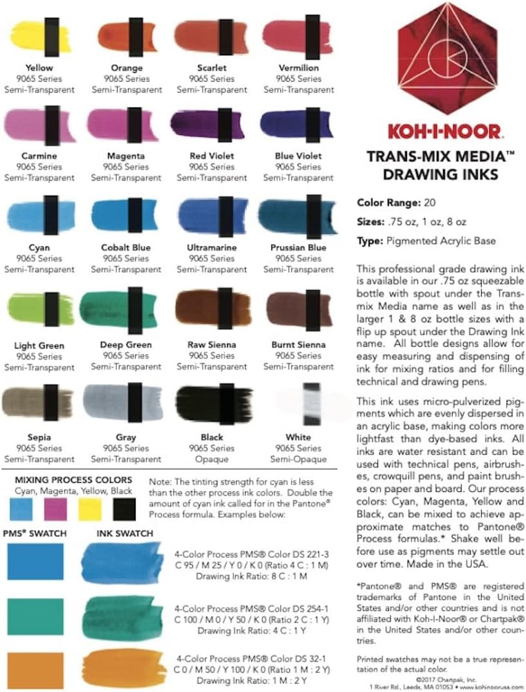 Koh-I-Noor Trans-mix Media/Drawing Ink uses micro-pulverized pigments which are evenly dispersed in an acrylic base, making colors more lightfast than dye-based inks. The colored inks are semi-transparent, the white ink is semi-opaque, and the black ink is opaque. All inks are water resistant and can be used with technical pens, airbrushes, crowquill pens, and paint brushes on paper and board. The Process colors: Cyan, Magenta, Yellow and Black, can be mixed to achieve approximate matches to Pantone Process formulas.